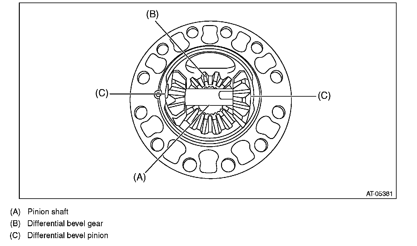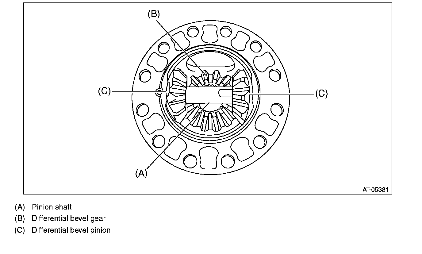 6) Remove the pinion shaft, then remove the differential bevel gear, washer and differential bevel pinion.
