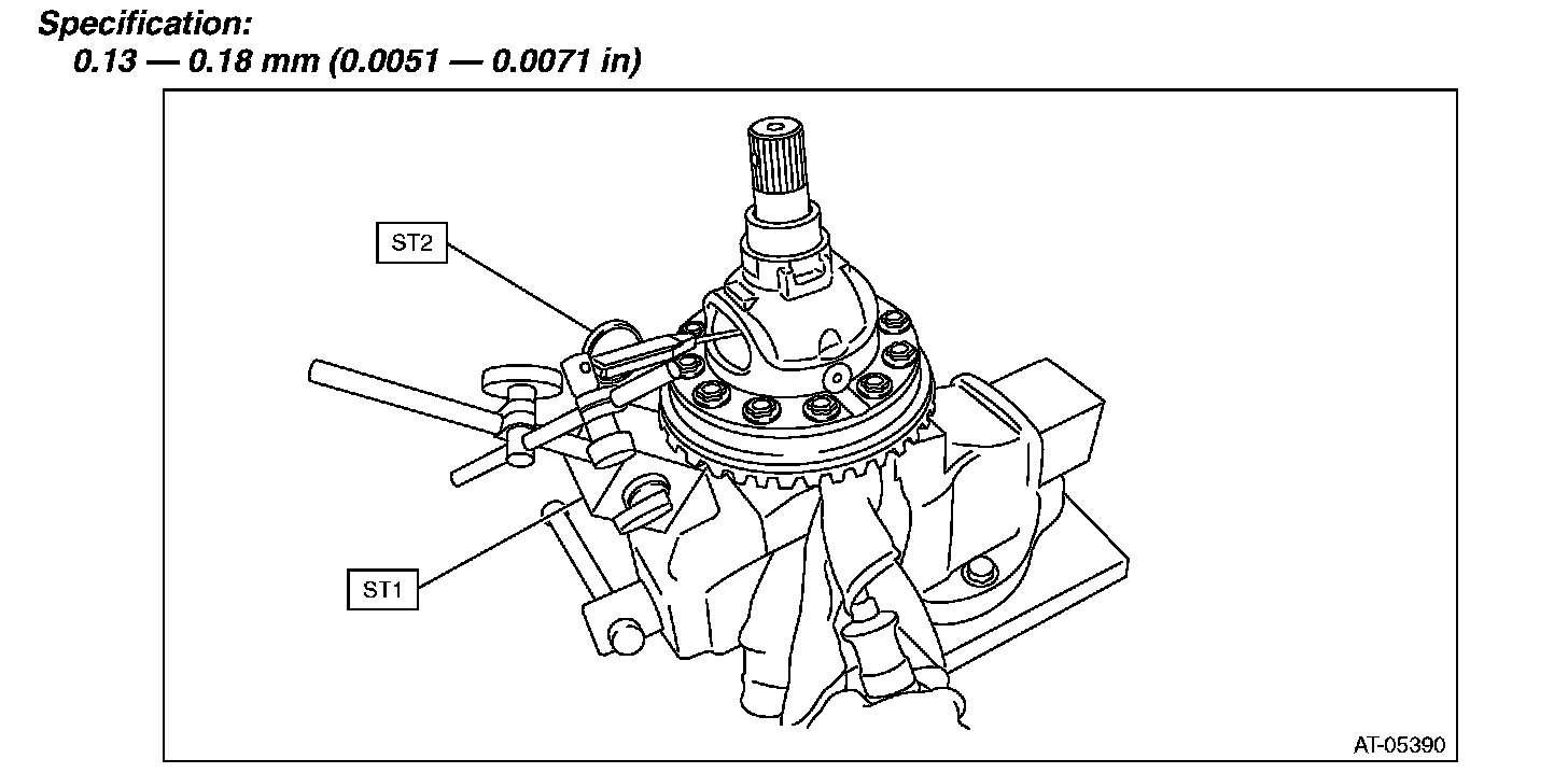 2) Measure the gear backlash using ST1 and ST2, and then insert the ST2 through the window of differential case.