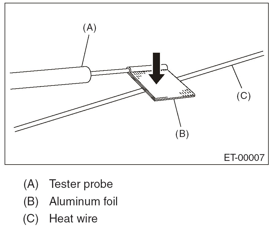 8. Slowly move the negative (-) tester probe along the heat wire. While moving the tester probe, find an open point where the voltage reading changes from 0.