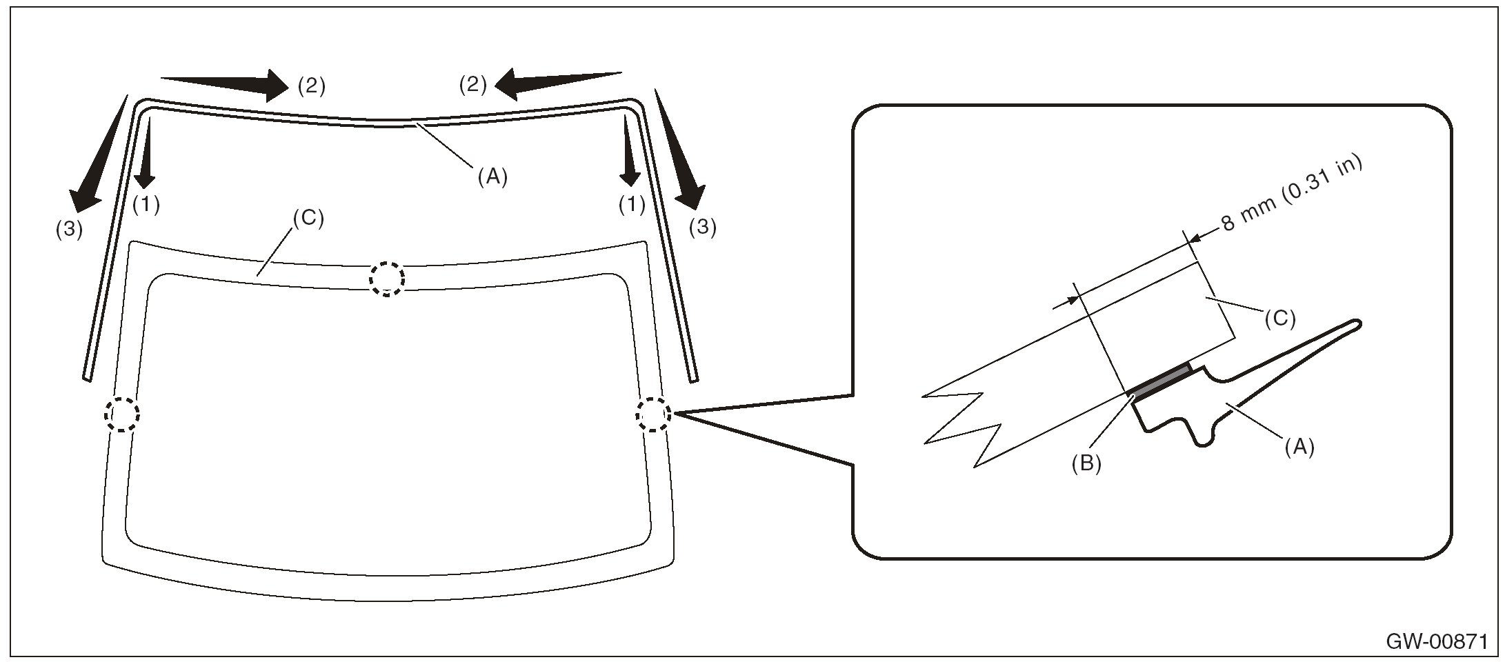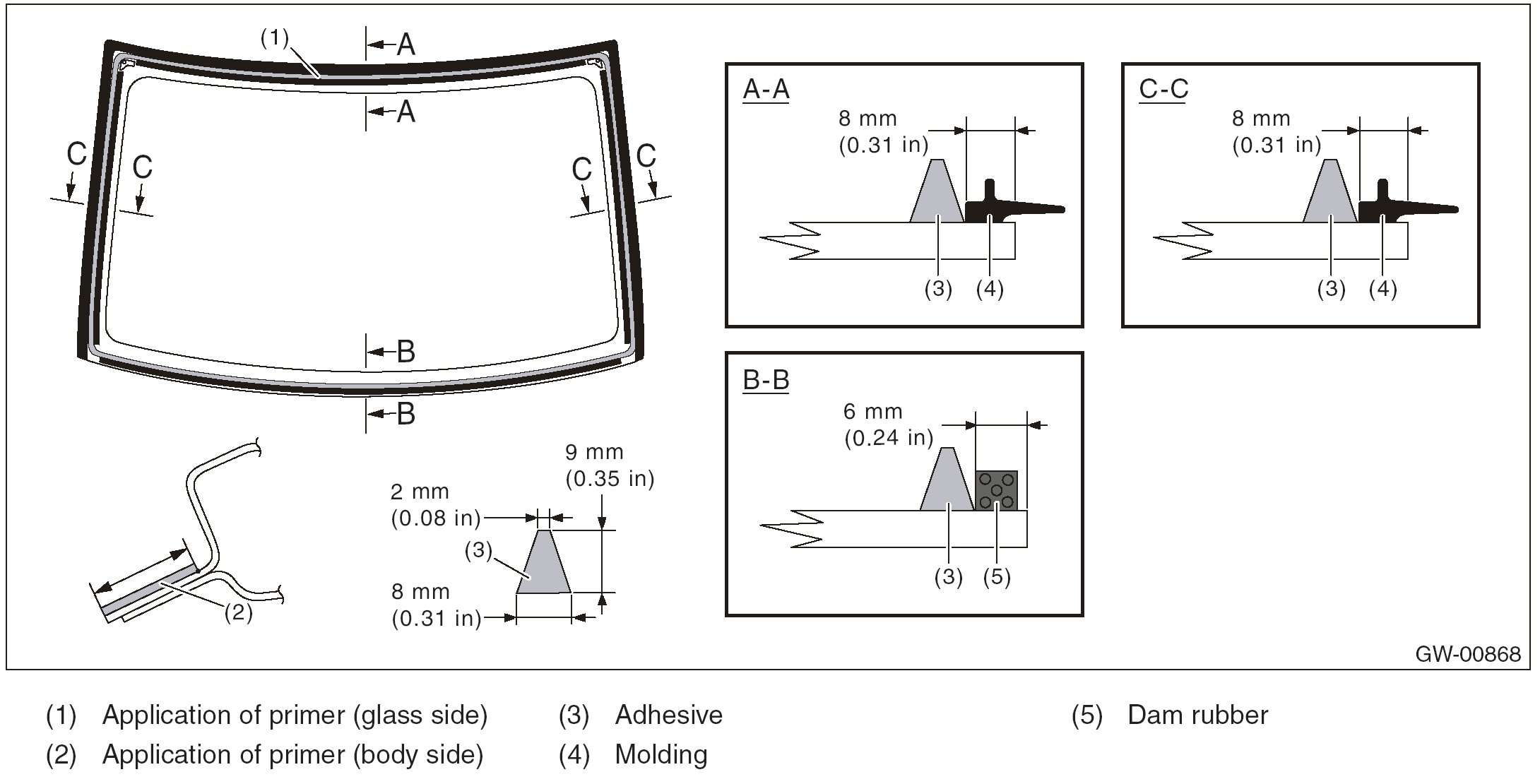 - For minimum drying time and vehicle standing time before driving after bonding, follow instructions or instruction manual from the adhesive manufacturer.