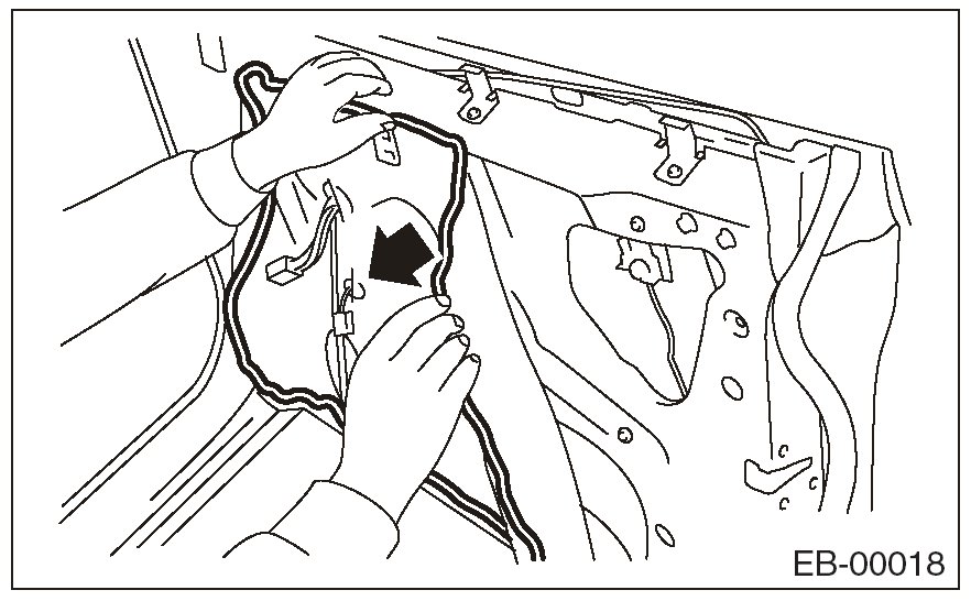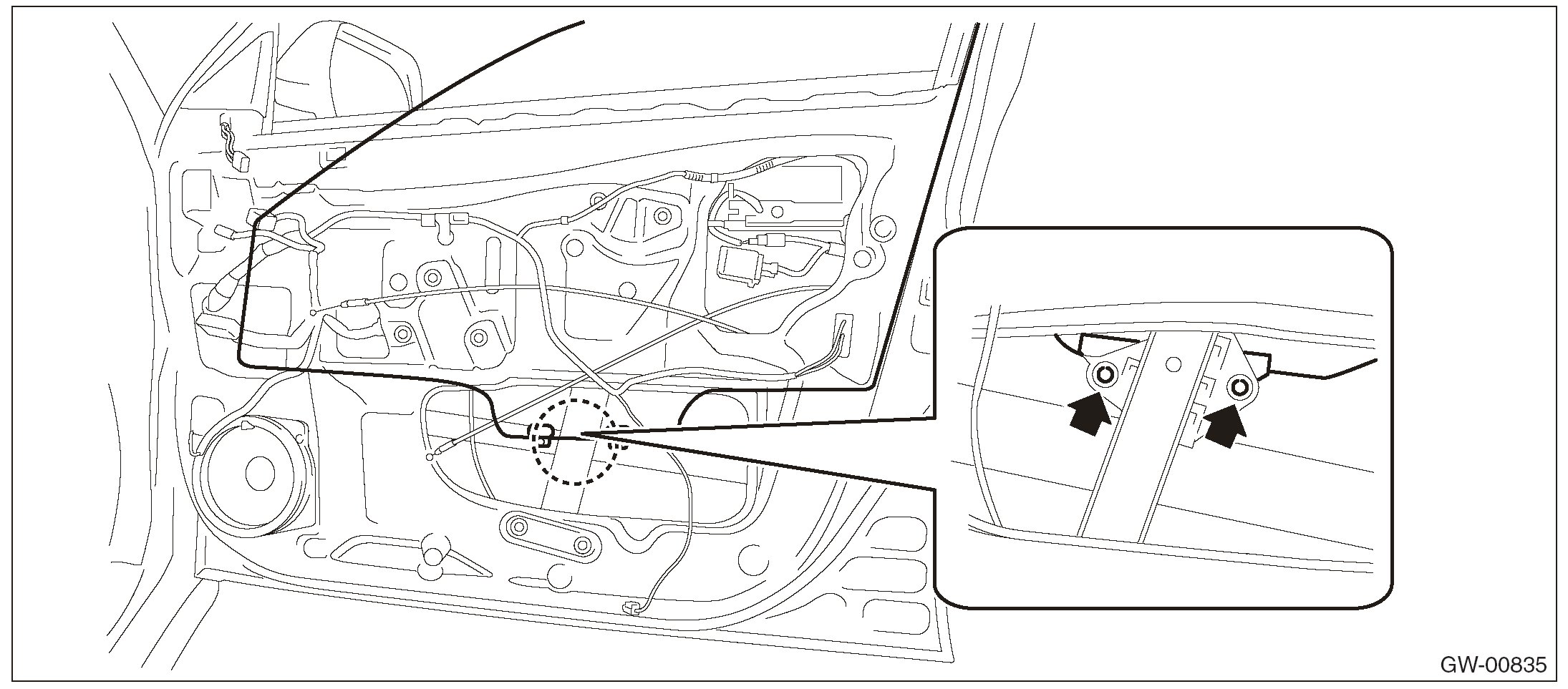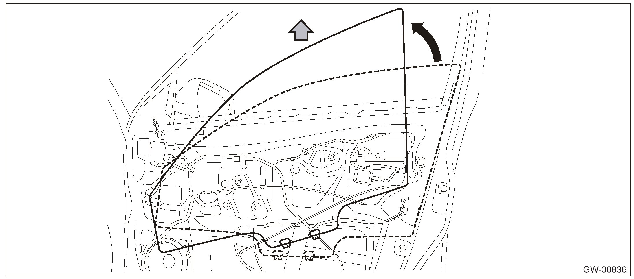 CAUTION: Make sure that the glass run rubber is placed securely in the door frame and sash. Install each part in the reverse order of removal.