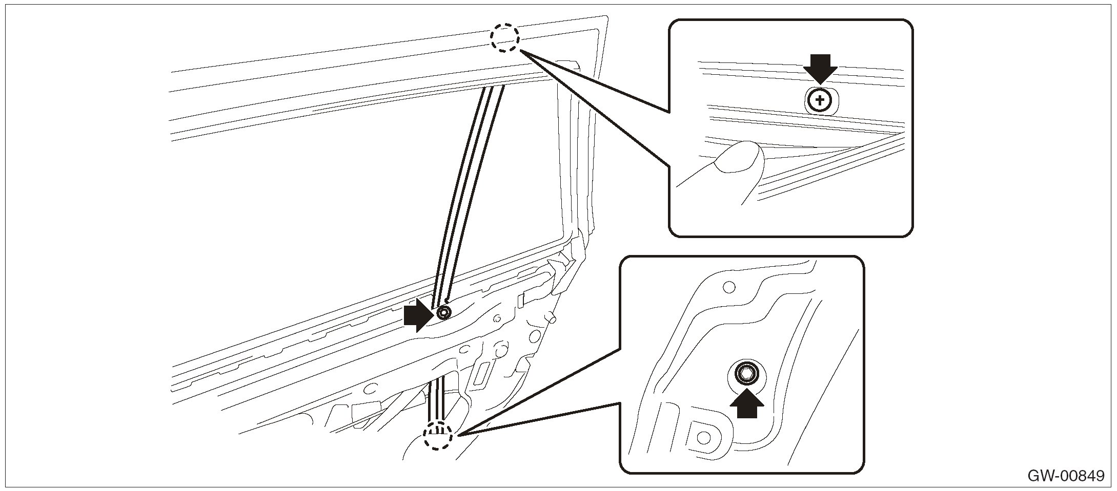 1. Operate the power window switch to move the rear door glass to the lowest position where the mounting bolts can be seen.