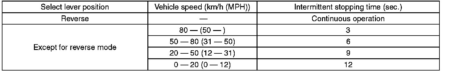 4. When the rear wiper switch is set to INT, is ON/OFF output repeated? (INT OFF time (when vehicle parked): 12 seconds)
