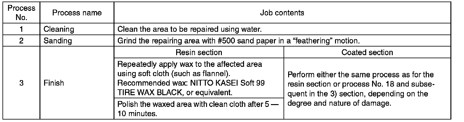 NOTE: All PP bumpers are provided with a grained surface, and if the surface is damaged, it cannot normally be restored to its former condition. Damages limited to the shallow scratches that cause only a change in the luster of the base material or coating, can be almost fully restored. Before repairing a damaged area, explain this point to the customer and obtain an understanding about the matter. Repair methods are outlined below, based on a classification of the extent of damage.