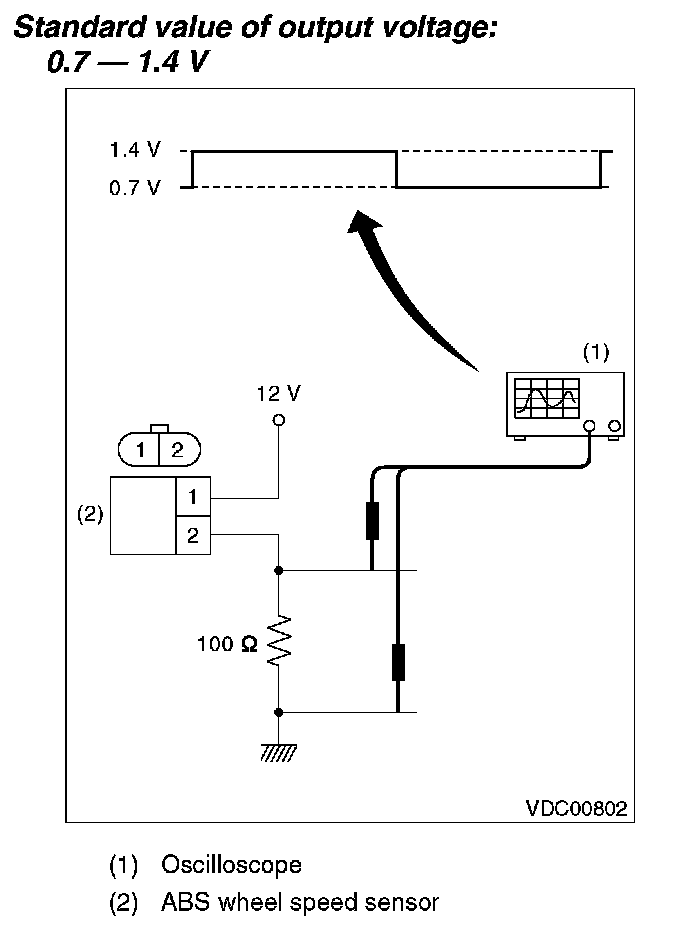 2) Connect a 12 V power supply to No. 2 terminal of sensor connector as shown in the figure, then attach resistance to the No. 1 terminal. Rotate the wheel at about 2.75 km/h (2 MPH), and measure the voltage using an oscilloscope.