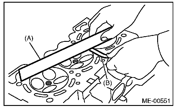 3) Check for warpage at mating surface between the cylinder block and cylinder head using a straight edge (A) and thickness gauge (B). If the warpage exceeds limit, replace the cylinder head.
