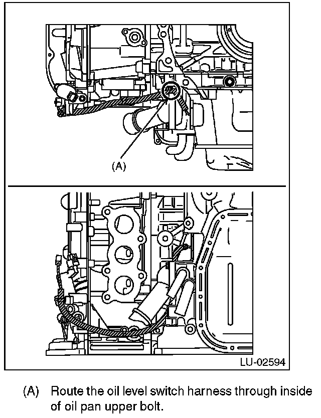 (A) Route the oil level switch harness through inside of oil pan upper bolt.