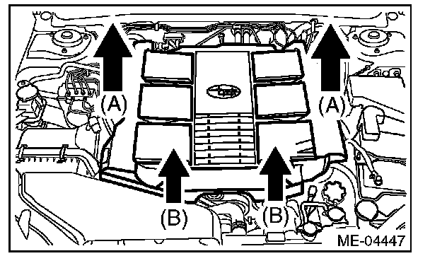 2) Lift up the front side holding two positions (B) while moving it in the forward direction of the vehicle.