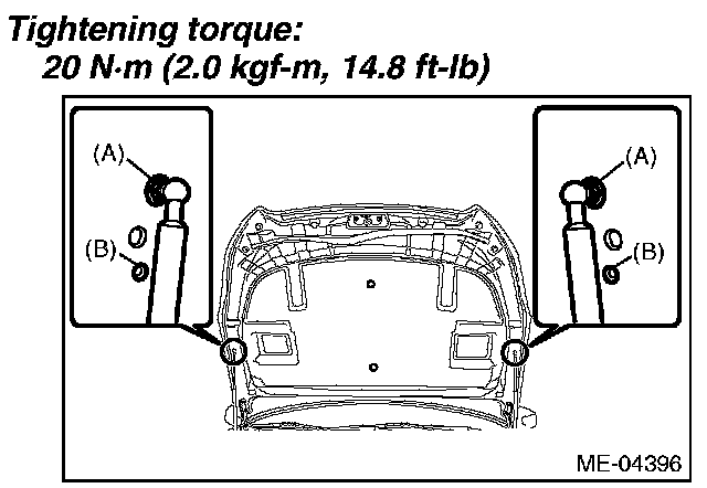 39) Change the front hood damper bolt mounting position from (B) to (A), and completely close the front hood.