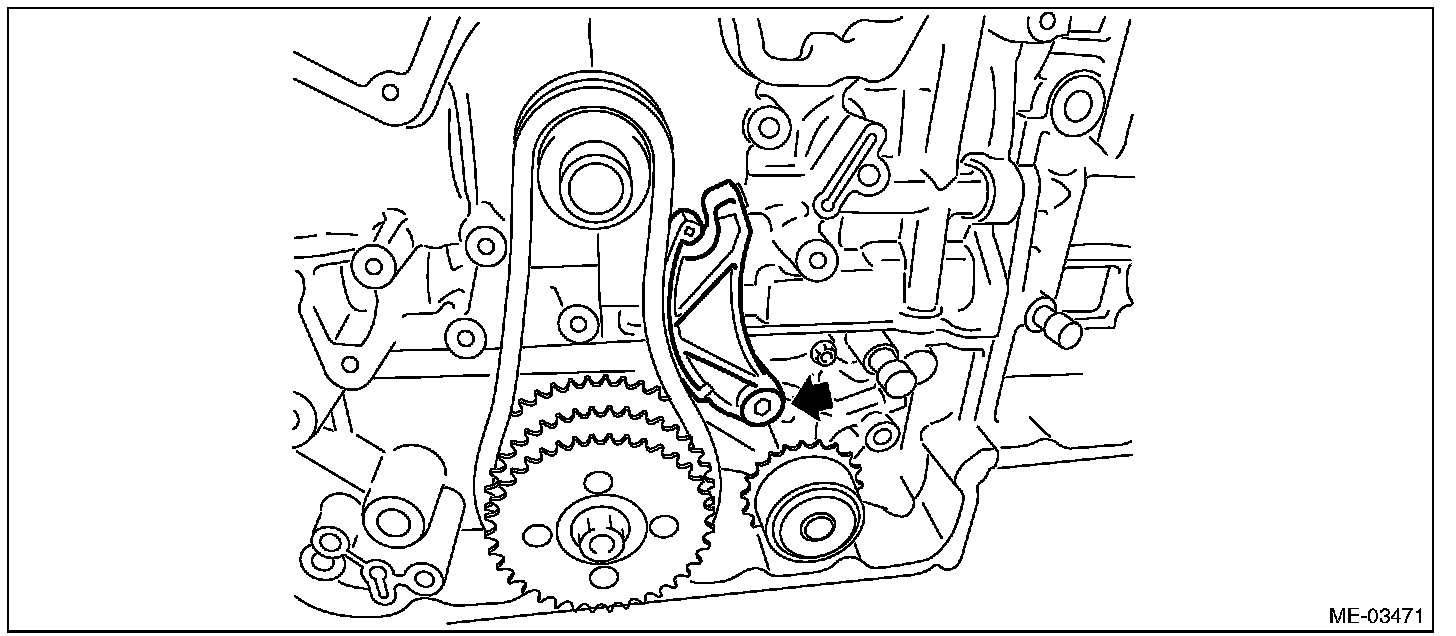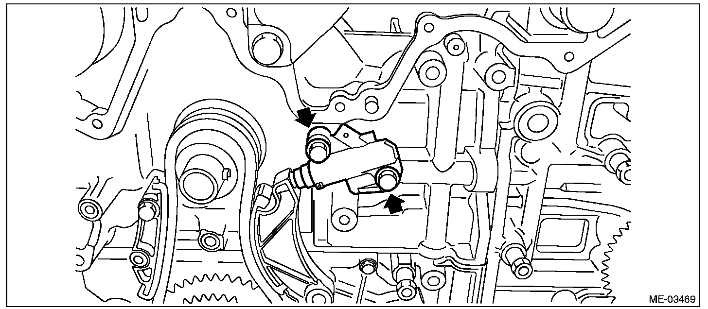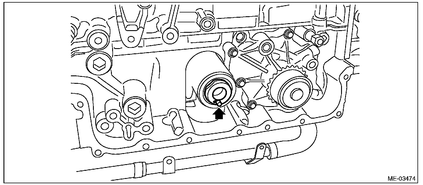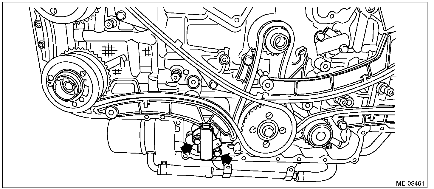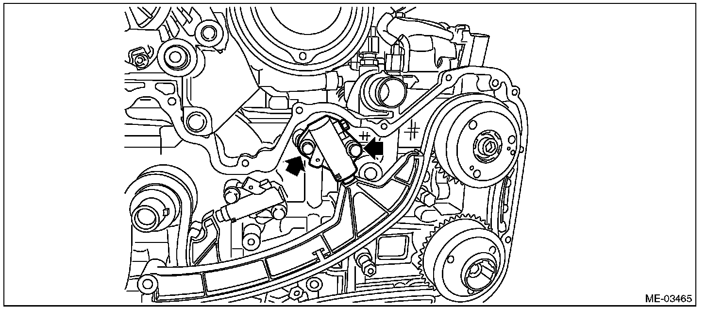 When removing chain tensioner (main), hold the plunger by hand so that it does not come flying out.