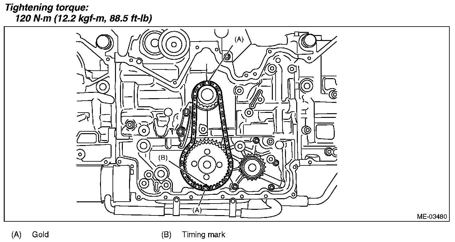 2) Make sure that the twelve o'clock position on the crank sprocket is aligned to the timing chain (main) mark (gold).