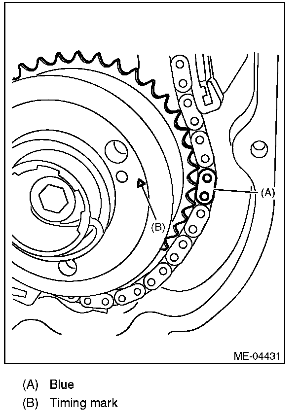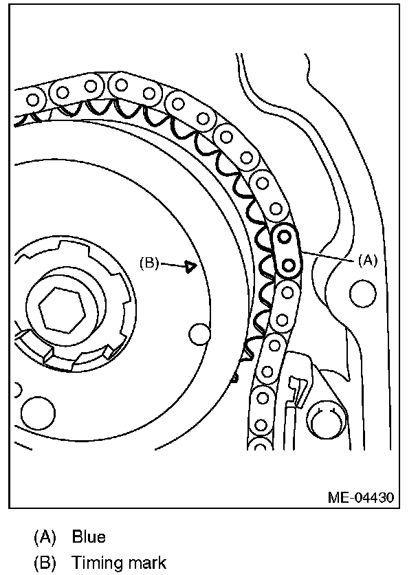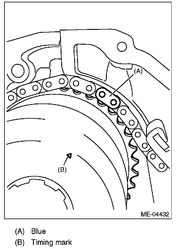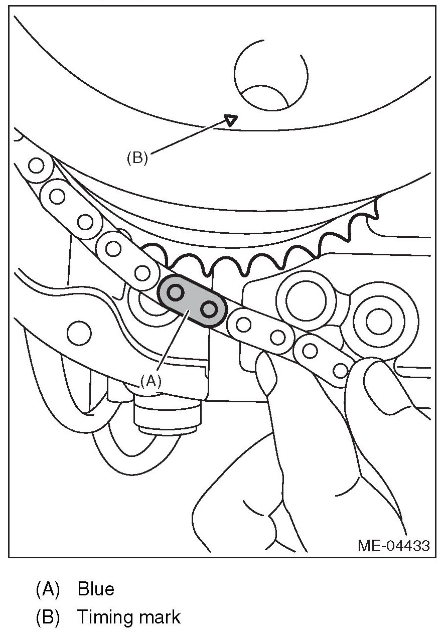 3) Make sure that the LH side cam sprocket timing mark is aligned to the timing chain mark (blue).