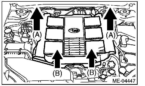 2) Lift up the front side holding two positions (B) while moving it in the forward direction of the vehicle.