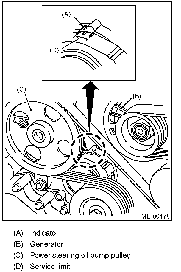 2) Make sure that the V-belt automatic belt tension indicator (A) is within the range (D).