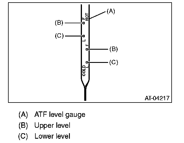 6) Remove the oil level gauge again and make sure that the ATF level is between upper and lower marks of the HOT side.