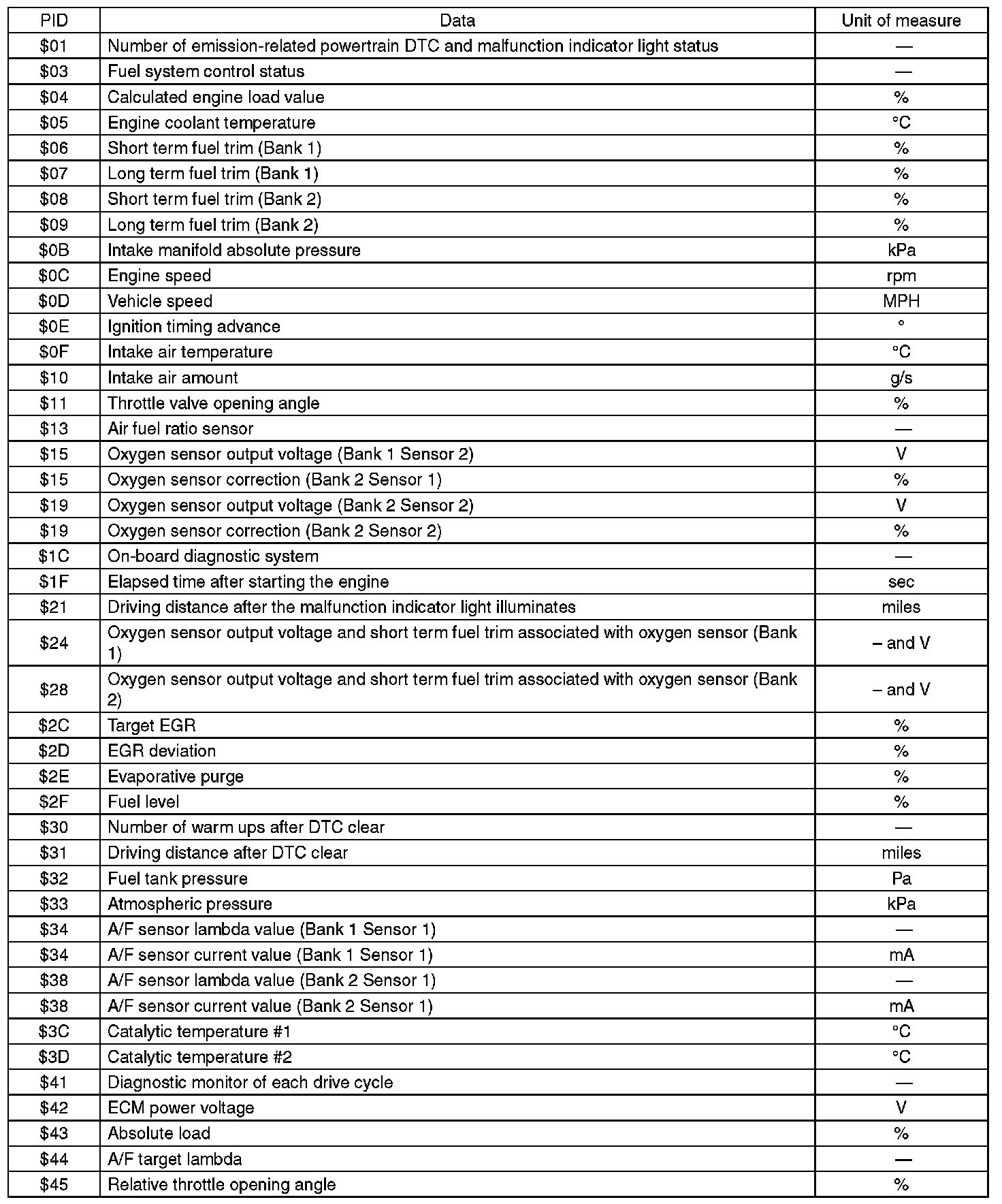 NOTE: Refer to general scan tool manufacturer's instruction manual to access the generic OBD-II PID (MODE $01).