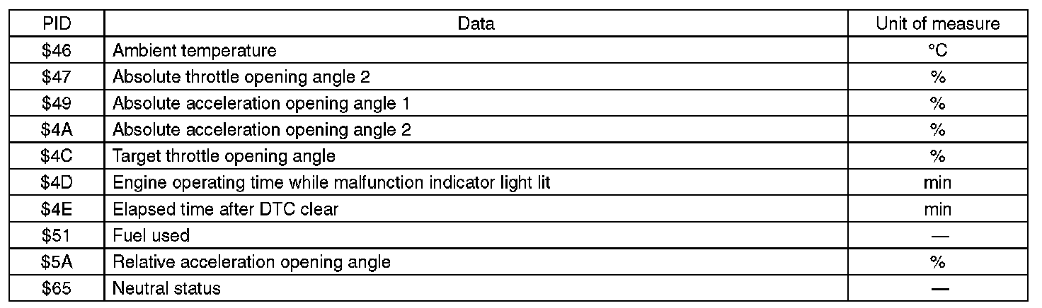 A list of the support data and PID (Parameter Identification) codes are shown in the following table.