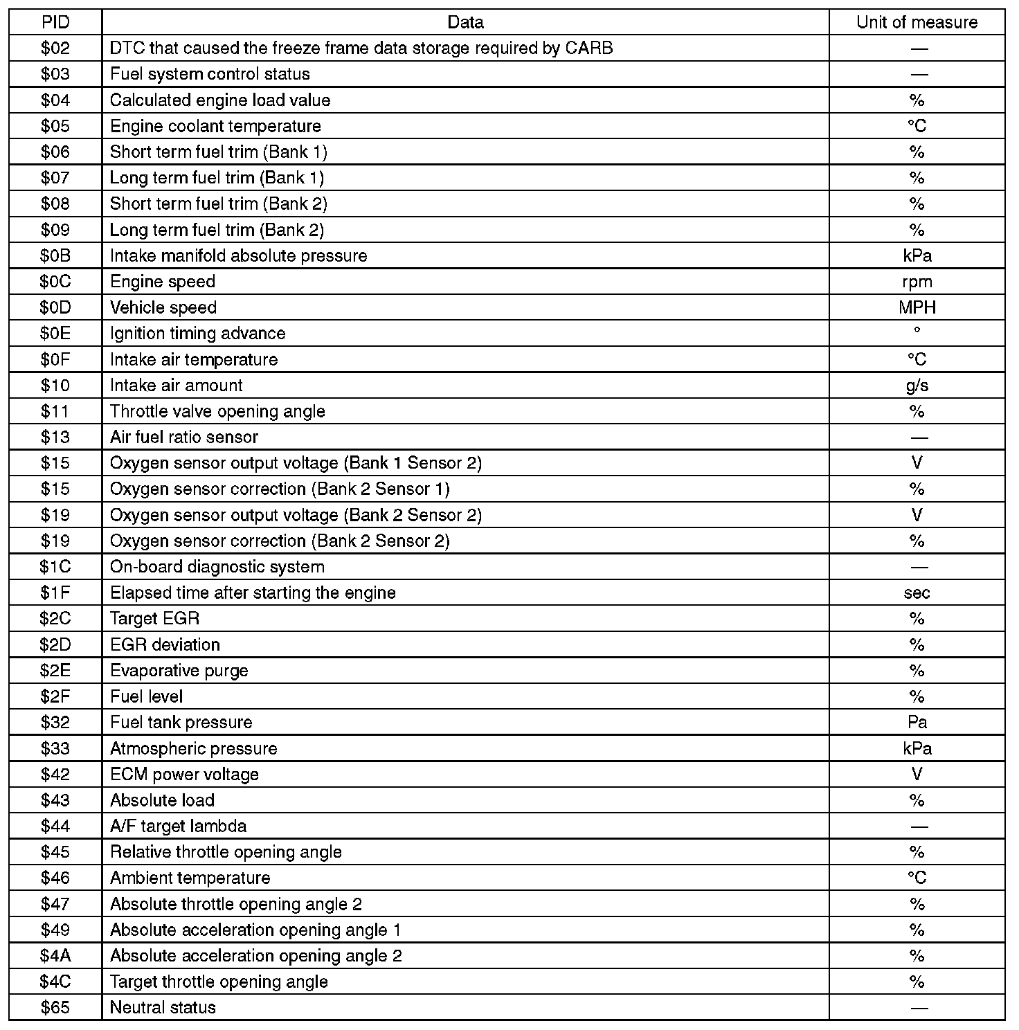 4. MODE $03 (EMISSION-RELATED POWERTRAIN DTC) Refer to "List of Diagnostic Trouble Code (DTC)" for information about data denoting emission-related powertrain DTC. List of Diagnostic Trouble Code (DTC)