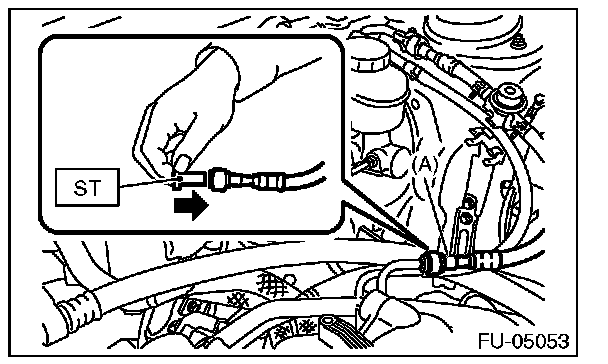 3. Attach ST to the fuel delivery pipe and push ST in the direction of arrow mark to disconnect the fuel delivery hose (A).