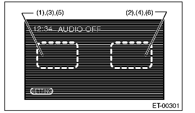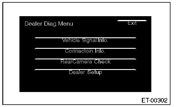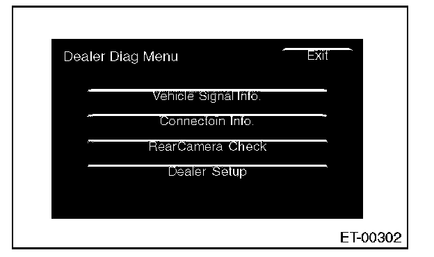 > key. When a screen other than the opening screen is displayed, press the <> key. Standard value: The map screen should be displayed. OK: Normal NG: If the map screen is not displayed, the following causes are possible. - The DVD-ROM is not set in the navigation system unit. - The DVD-ROM is inserted with its wrong side. - The type of DVD-ROM is wrong. - The DVD-ROM has scratches etc. If there are no problems on the DVD-ROM, the main body is defective. 3. CHECK CONNECTION CHECK AUX 1. Press <> key to display the Audio OFF screen. 2. Touch the screen in the order of (1) to (6) shown in the figure. 3. The display will switch to the Dealer Diag Menu screen. 4. Touch {Connection Info.} on the <> screen. 5. Check that "Connect" is displayed in the respective section of AUX. Connect: Normal. NC: Abnormal. Check the signal line connection. If there are no problems, the unit could be faulty. 4. CHECK EACH VEHICLE SIGNAL 1. Press <> key to display the Audio OFF screen. 2. Touch the screen in the order of (1) to (6) shown in the figure. 3. The display will switch to the Dealer Diag Menu screen. - CHECK GPS ANTENNA NOTE: When checking the GPS antenna, perform the check operation outdoors to improve the receiver sensitivity. 1. Touch {Vehicle Signal Info.} on the <> screen. 2. Check that "Connect" is displayed in the GPS Antenna item. Connect: Normal. NC: Abnormal. Check the GPS antenna connection. - CHECK BACK SENSOR NOTE: Before starting inspections, check the safety around the rear end of the vehicle and then turn the ignition switch to ON. 1. Touch {Vehicle Signal Info.} on the <> screen. 2. Pull the parking brake and depress the brake, then put the gear in reverse. 3. Make sure that "ON" is displayed in the Reverse item. ON: Normal. OFF: Abnormal. Check the signal line connection. If there are no problems, the unit could be faulty. - CHECK ILLUMINATION NOTE: Before starting inspections, turn the ignition switch to ON. 1. Touch {Vehicle Signal Info.} on the <> screen. 2. Turn the lighting switch to level 1. Make sure that the bright switch is not turned ON at this time. 3. Make sure that "ON" lights in the Illumination item and then the screen fades out. ON: Normal. OFF: Abnormal. Check the signal line connection. If there are no problems, the unit could be faulty. - CHECK SPEED SENSOR NOTE: - Before starting inspections, check the safety around the vehicle. - Lift up the vehicle as necessary. - When the diagnostic trouble code is input in the VDCCM, perform the Clear Memory operation. 1. Touch {Vehicle Signal Info.} on the <> screen. 2. Move the vehicle 2 to 3 meters (6.6 to 9.8 ft). 3. Check that "ON" is displayed in the Speed item. ON: Normal. OFF: Abnormal. Check the signal line connection. If there are no problems, the unit could be faulty. - CHECK IGNITION SIGNAL 1. Touch {Vehicle Signal Info.} on the <> screen. 2. Turn the ignition switch to ON. 3. Check that "ON" is displayed in the IGN item. ON: Normal. OFF: Abnormal. Check the signal line connection. If there are no problems, the unit could be faulty. - CHECK PARKING BRAKE SIGNAL 1. Touch {Vehicle Signal Info.} on the <> screen. 2. Pull parking brake lever. 3. Check that "ON" is displayed in the Parking item. ON: Normal. OFF: Abnormal. Check the signal line connection. If there are no problems, the unit could be faulty.