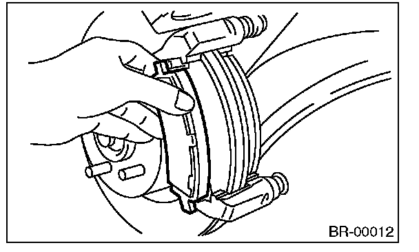 ^ A wear indicator is installed on the inner disc brake pad. If the pad is worn to the limit, the end of wear indicator contacts disc rotor, and a squeaking sound is heard as the wheel rotates. If the sound is heard, replace the pad.