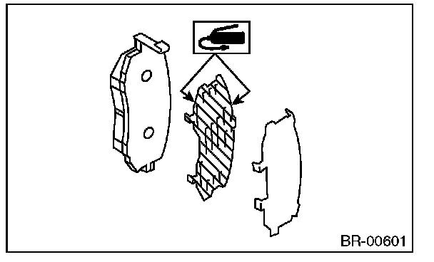 2) Apply a thin coat of Molykote AS880N (Part No. K0777YA010) or grease contained in the pad kit to both surfaces of the pad inner shim.