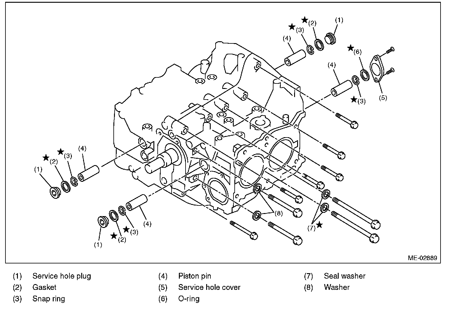 25) Rotate the crankshaft to bring #1 and #2 pistons to bottom dead center position, then remove the piston snap ring through service hole of #1 and #2 cylinders.