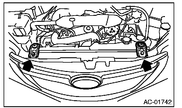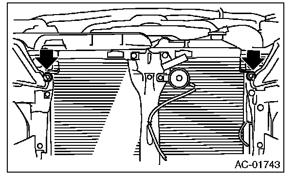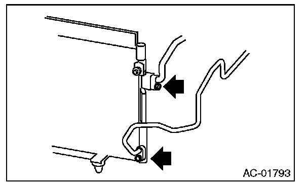 6. Remove two bolts. While lifting the condenser, pull out through space between the radiator and the radiator panel.