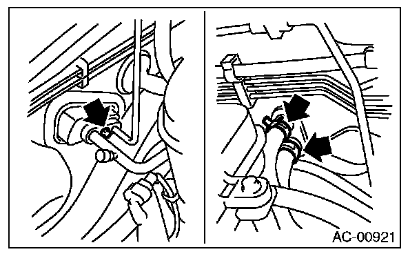 4. Remove the bolts securing expansion valve and pipe in engine compartment. Release the heater hose clamps in engine compartment to remove the hoses.