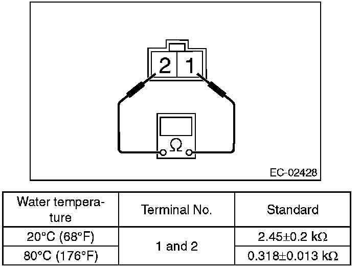 2. Raise water temperature gradually, measure the resistance between the engine coolant temperature sensor terminals when the temperature is 20 ° (68 °F) and 80 °C (176 °F).