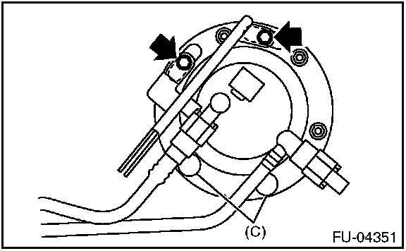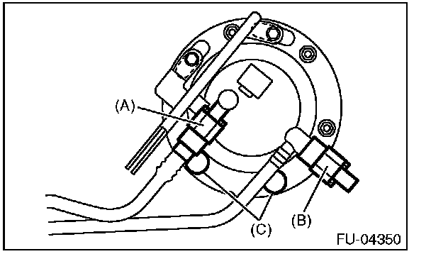 - Align protrusion (B) of the fuel sub level sensor to the cut out in the fuel sub level sensor upper plate.
