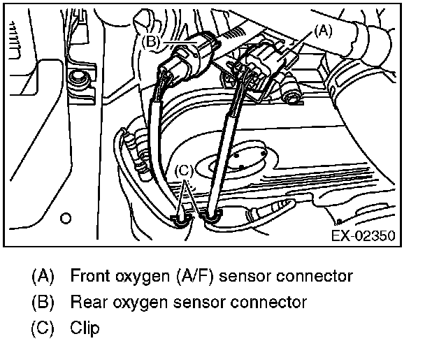 4. Remove the clip fastening the harness and disconnect the front oxygen (A/F) sensor connector.
