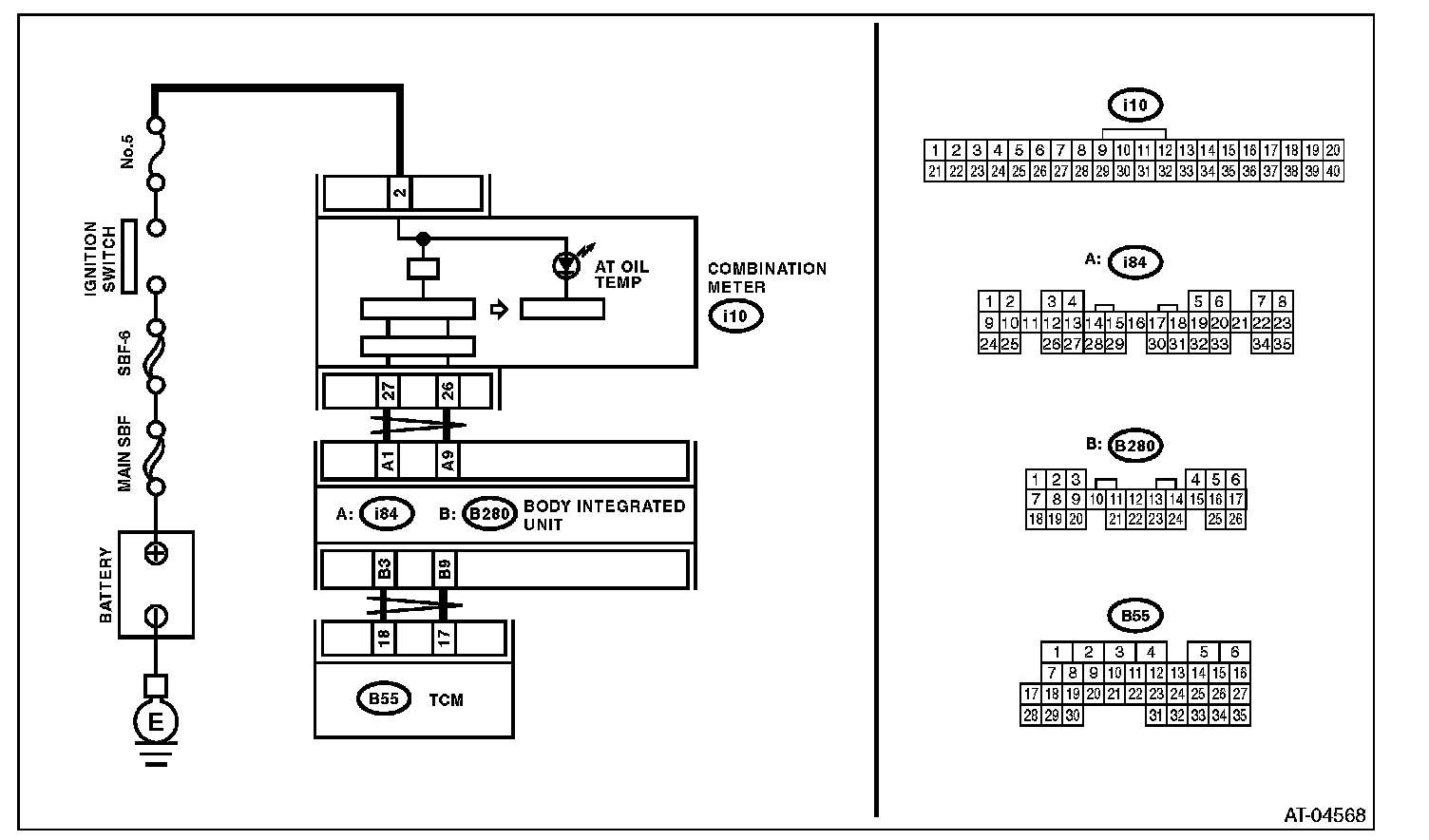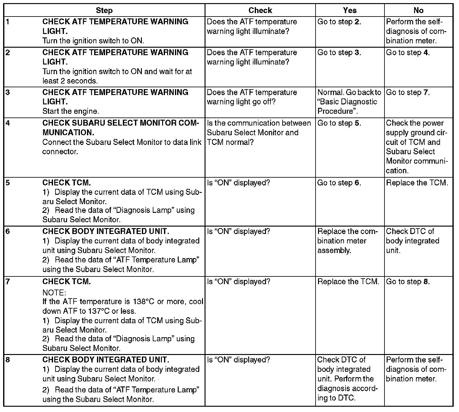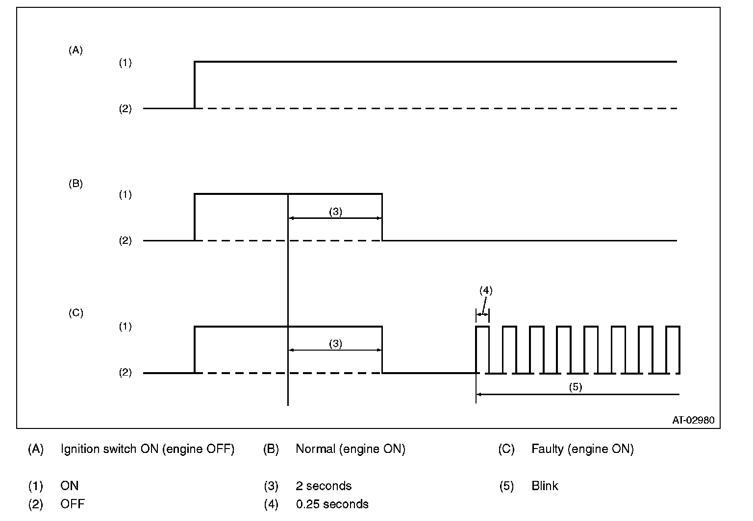 When any on-board diagnostics item is malfunctioning, the ATF temperature warning light blinks. The light keeps blinking from when the malfunction is detected after starting the engine, until the ignition switch is turned OFF. The faulty parts or unit can be identified by reading DTCs. Problems which occurred previously can also be identified through the memory function. If the ATF temperature warning light does not illuminate when a problem actually occurs, the problem can be determined by checking the performance characteristics of each sensor using the Subaru Select Monitor. Warning light signal patterns are shown in the figure.