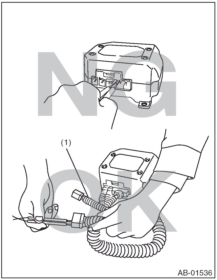 - When checking, use a test harness (1). Damage to connector terminal cause malfunction. Do not directly apply the tester probe to connector terminal of airbag.