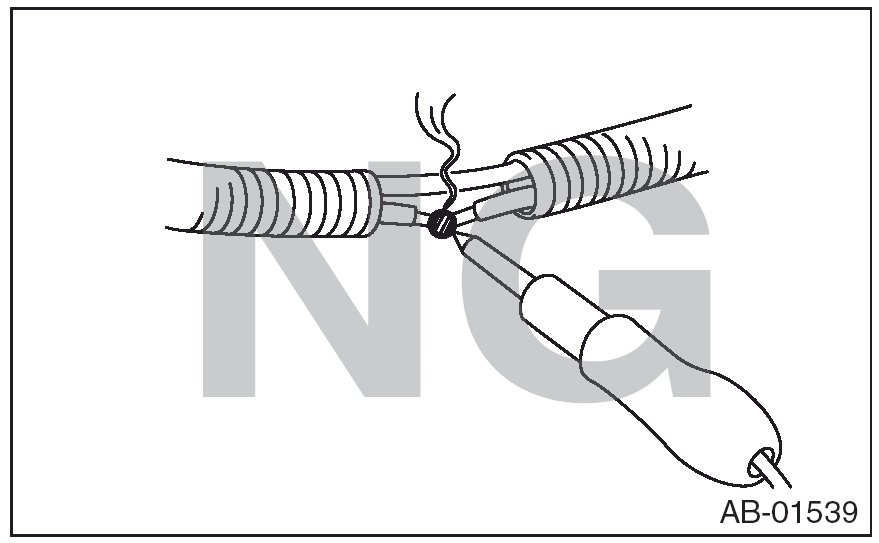 - If damage, open circuit or rust is found on airbag system wiring harness, do not use a soldering equipment to repair. Replace the faulty harness with a new genuine part.