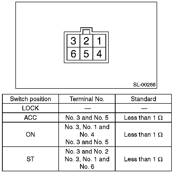 4. Turn the ignition key plate to each position and check the continuity between terminals of ignition connector.
