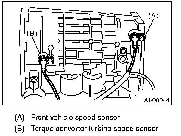 20) Remove the front vehicle speed sensor and torque converter turbine speed sensor.