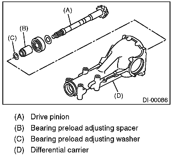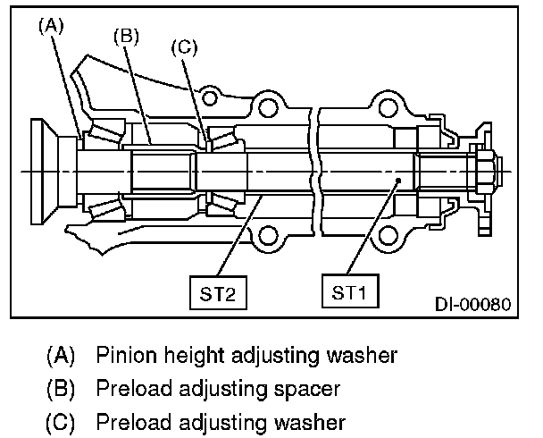 Adjust the bearing preload between front and rear bearings with spacer and washer. Pinion height adjusting washer is not affected by this adjustment. The adjustment must not be carried out with oil seal inserted.