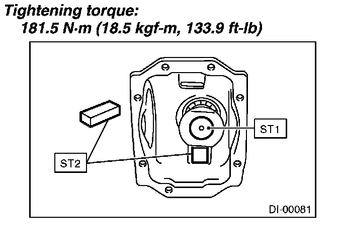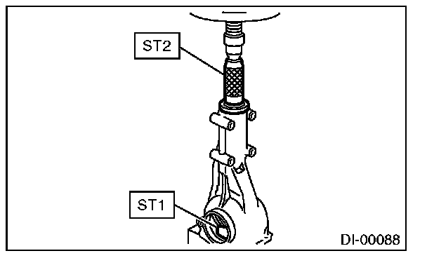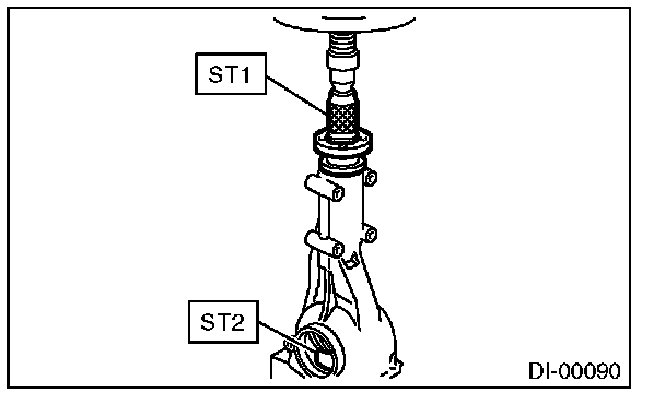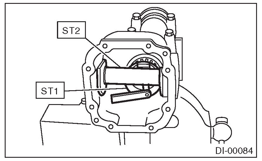 2) Install the front bearing race to the differential carrier using ST1 and ST2.
