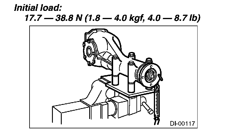 7) At the same time, measure the total preload of the drive pinion. Compared with the resistance when differential case is not installed, if the total preload is not within specification, adjust the thickness of side retainer shims, increasing/reducing both shims by an even amount at a time.
