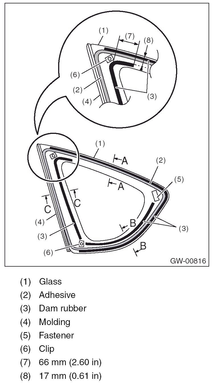 4. Apply adhesive with the dam rubber installed in the same procedure as for windshield glass. {Ref. to INSTALLATION, Windshield Glass.}
