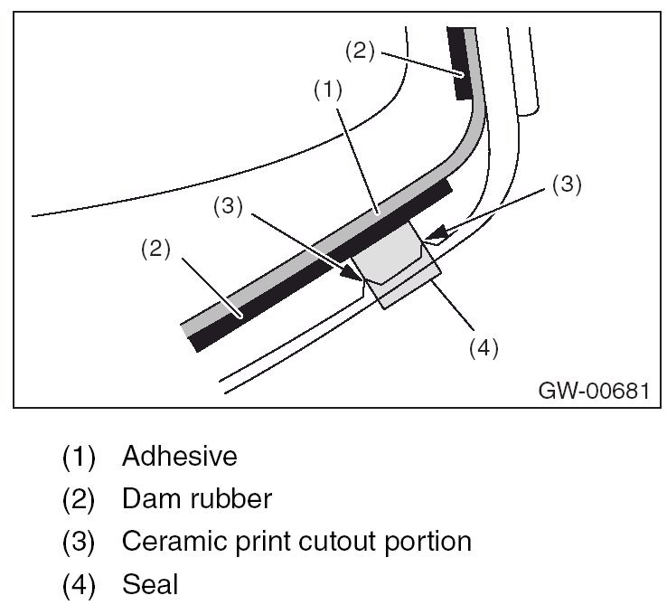 - Attach the seal between the ceramic print cutout portions (3) located at the lower edge of the glass (driver's seat side).