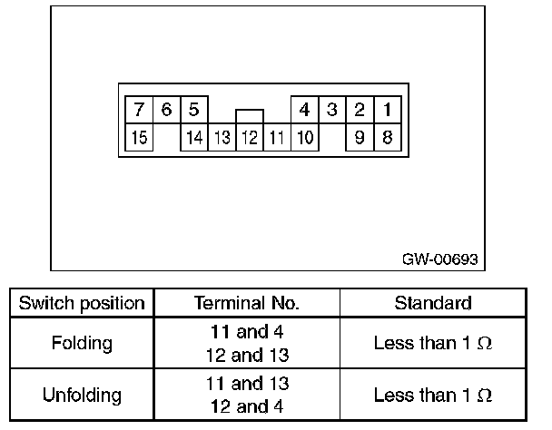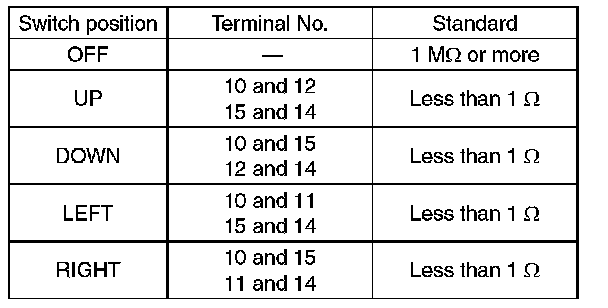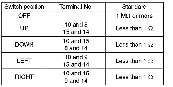 Move the remote control mirror switch to each position and check continuity between terminals.