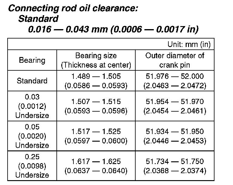 5) Measure the oil clearance on each connecting rod bearing using plastigauge. If any oil clearance is not within the standard, replace the defective bearing with a new part of standard size or undersize as necessary. (See the table below.)