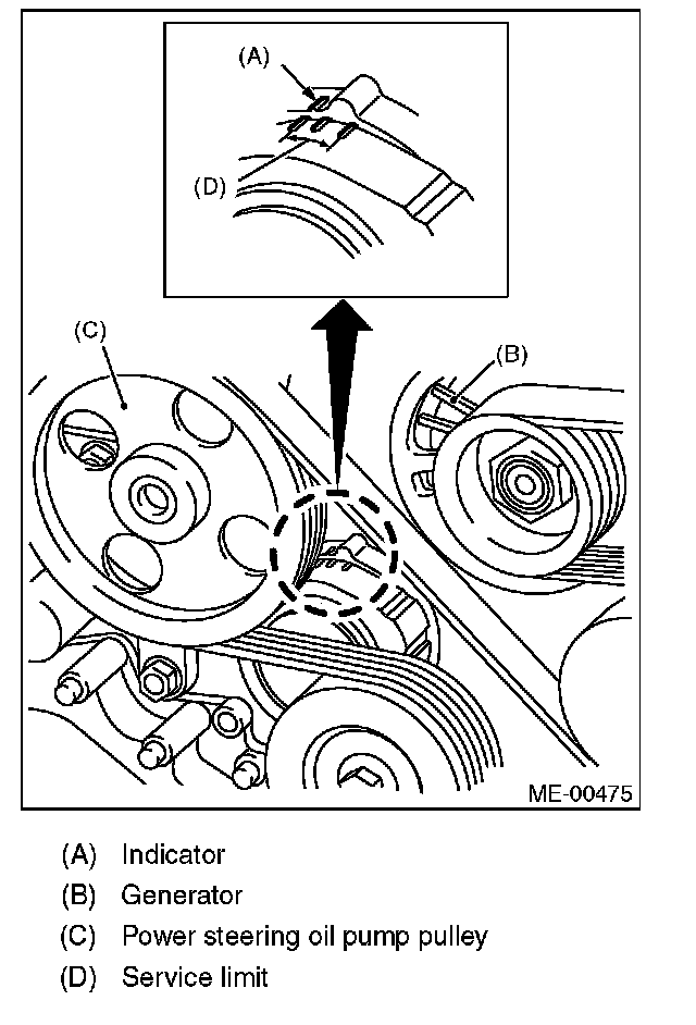 2) Make sure that the V-belt automatic belt tension indicator (A) is within the range (D).