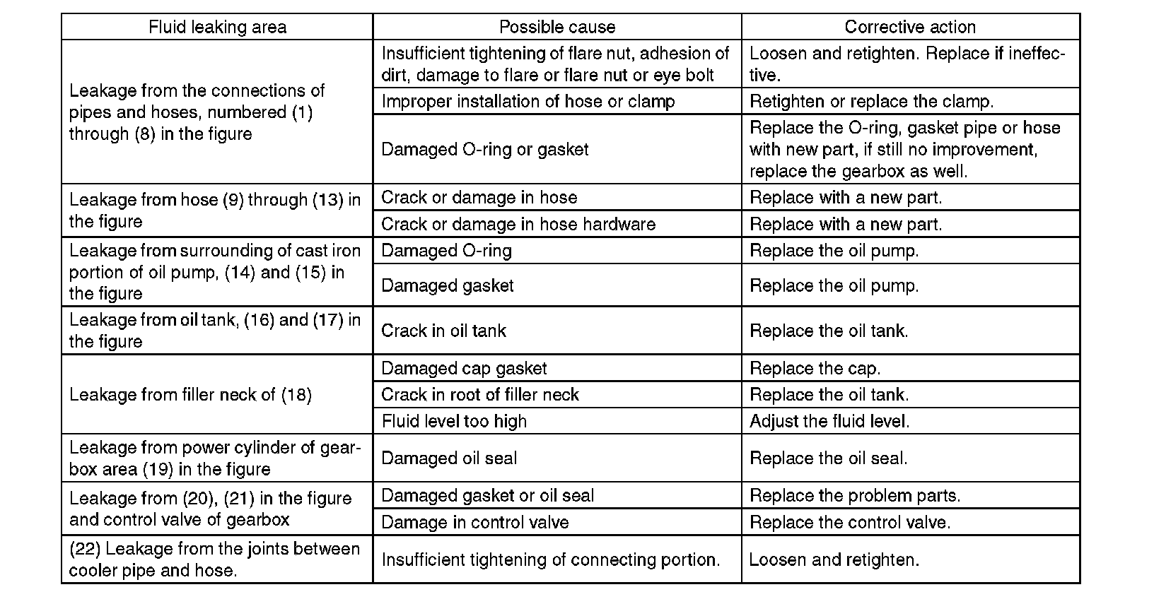 There are conditions in which a fluid leak is diagnosed, but is not actually leaking. This is because the fluid spilt during the last maintenance was not completely wiped off. Be sure to wipe off spilt fluid thoroughly after maintenance.