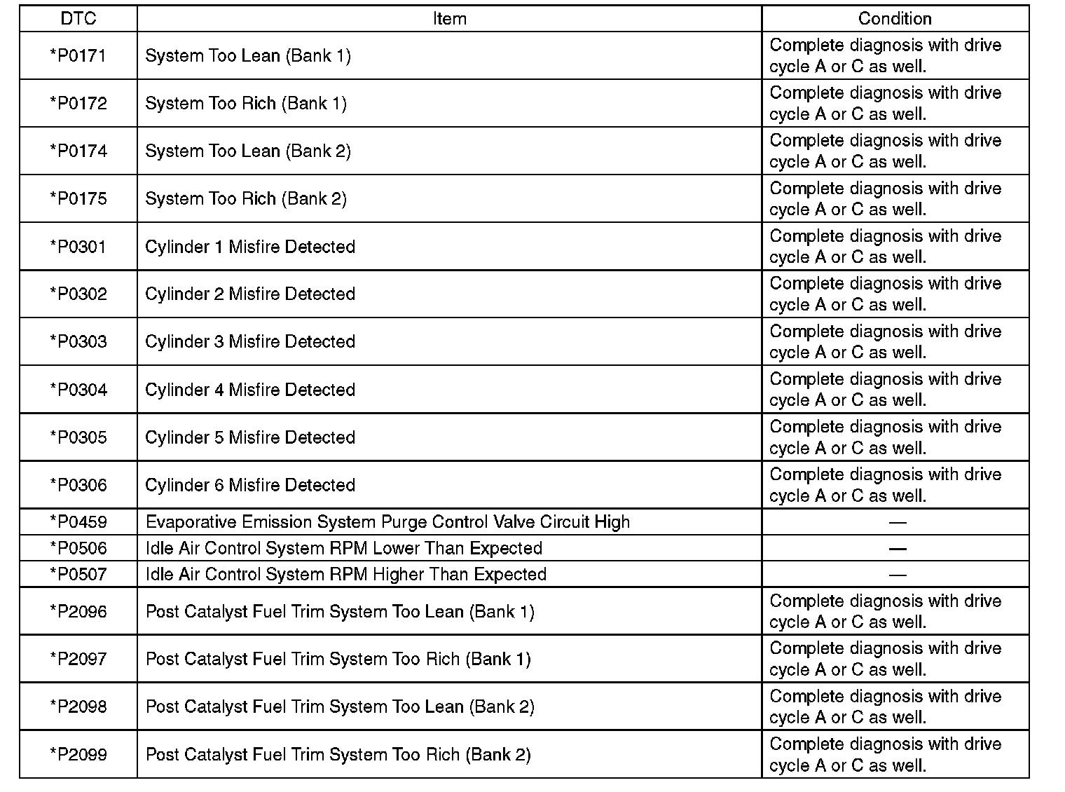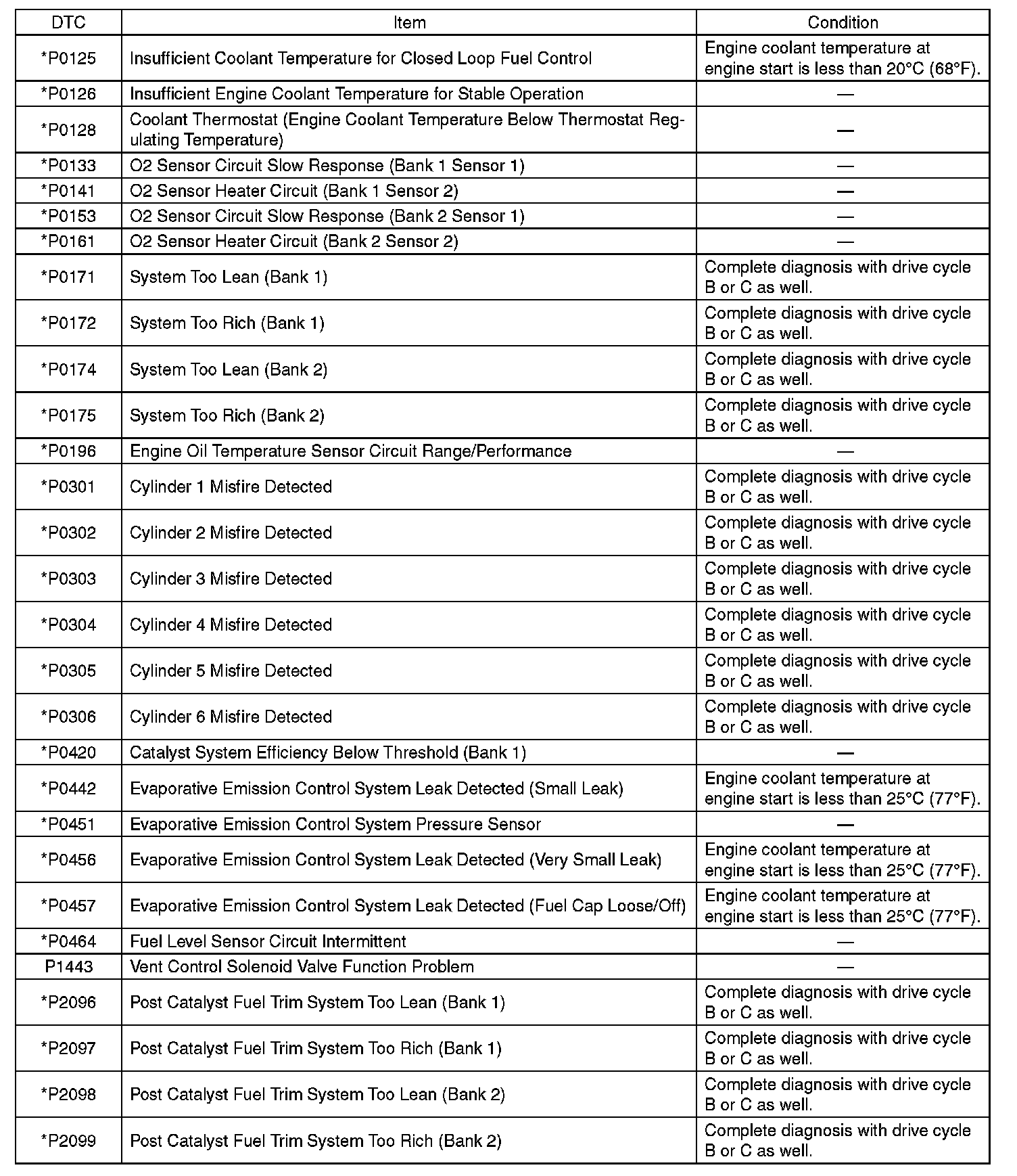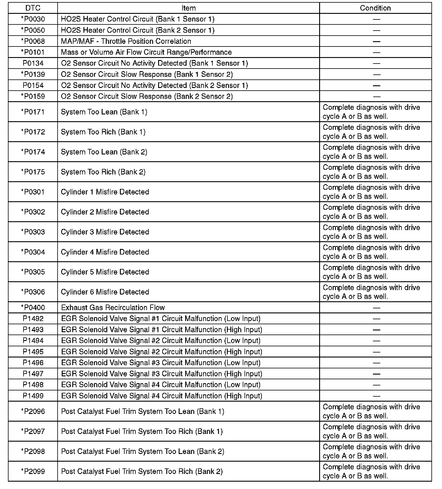 - Perform the drive cycle twice if the DTC in the list is marked with *. After completing the first drive cycle, stop the engine and perform second diagnosis in same condition.
