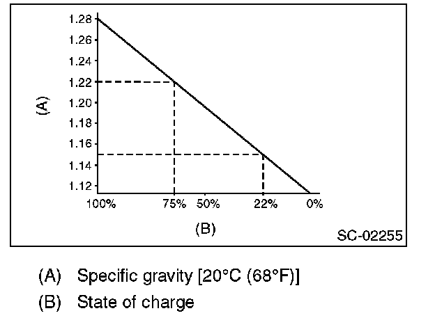 2. Measuring the specific gravity of the electrolyte in the battery will disclose the state of charge of the battery. The relation between specific gravity and state of charge is as shown in the figure.