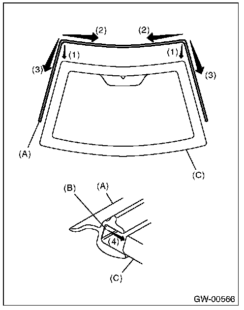 1. Align the molding (A) with both ends of the upper edge of the windshield glass (C).