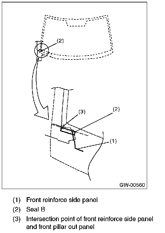 7. Apply the seal B (2) to terminal section of front reinforce side panel (1) and the intersection point (3) of front reinforce side panel and front pillar out panel.